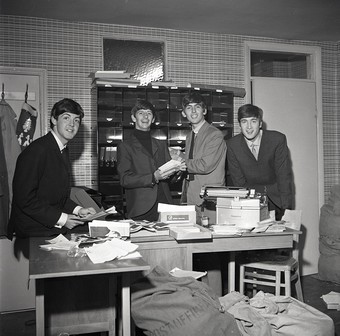 Paul McCartney malt ein Schild, das während der Live-Übertragung von »All You Need Is Love« vor 400 Millionen Zuschauer:innen, die via Satellit an den Fernsehgeräten dabei waren, gezeigt wurde 1967