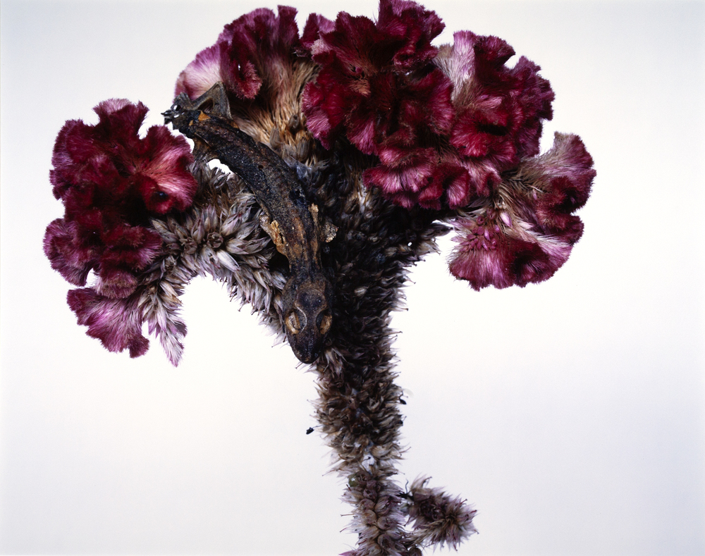 Durch die Hochglanzoberflächen der Abzüge, ihre auffällige Farbigkeit und die deutlich erkennbaren Texturen der Blüten verführen die Nahaufnahmen zum Anfassen. Blumen sind für Araki Sinnbilder des Weiblichen, für das Männliche stehen die Eidechsen »Jamorinsky«, die darauf platziert sind. In Arakis Symbolik existiert allerdings Eros selten ohne Thanatos: Die Beschaffenheit der vertrockneten Reptilien sowie die mehr-oder-minder fortgeschrittene Verwelktheit der Blüten verweisen auf die Vergänglichkeit aller Sinnesfreuden.