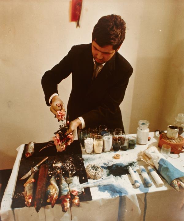 Anders als seine Kollegen bezog Schwarzkogler den Raum in sein formales Konzept mit ein. Indem er die Wände blau und weiß tünchte und blaue Objekte – einen Zylinder, eine Kugel und zwei Bretter – im Raum platzierte, schuf er ein Environment für seine Aktion. Auf einem weiß gedeckten Tisch arrangierte er Utensilien wie in einem Labor, darunter Fische, ein in Papier eingewickeltes Huhn, feine Kristalle in verschiedenen Farben, Gläser mit blauer Farbe, sowie Mullbinden und chirurgisches Werkzeug. Typische Motive sind der schwarze Spiegel und die Kugel, die auch in Schwarzkoglers folgenden Aktionen wiederkehrten.