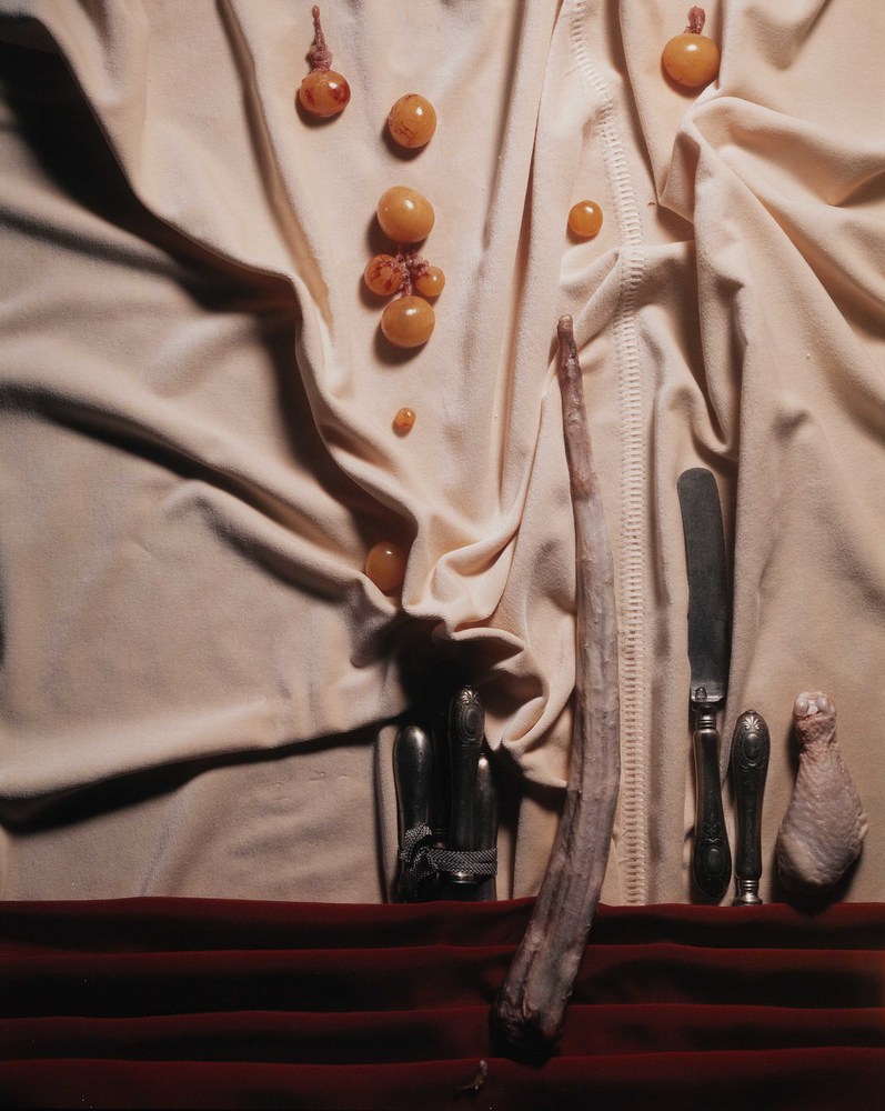 Die Bildhauerin und Fotokünstlerin Helen Chadwick wurde vor allem mit ihren Installationen mit organischen Materialien und Motiven aus der Pflanzenwelt bekannt. Darin setzte sie sich mit dem menschlichen Körper, soziokulturellen Zuschreibungen und Geschlechter-Stereotypen auseinander. Im Londoner Victoria & Albert Museum entstand 1989 mit der 20x24-inch Polaroidkamera die 8-teilige Serie »Meat Abstract«. Auf verschiedenen Textilien, Leder und Dekorplatten arrangierte sie rohe Innereien und Fleischteile, die als gekochte Speisen in vielen Kulturen zu Delikatessen zählen, wie etwa Rinds- oder Schweinszunge, ungelegte Eier, Ochsenschwanz und Hühnerkeule. Im Mittelpunkt steht nicht das Objekt als Gegenstand des Interesses, sondern das »Abjekt«, das Ekel erregt oder abstößt und die existenzielle Grenze zwischen Subjekt und Objekt, Kultur und Natur infrage stellt.