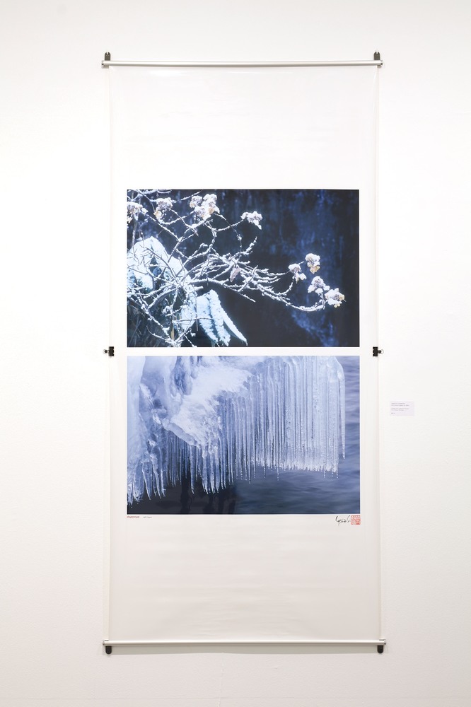 Die Prints sind auf die traditionelle japanische Art mit Alu-Schienen-Montagen als hängende Rollbilder gerahmt.