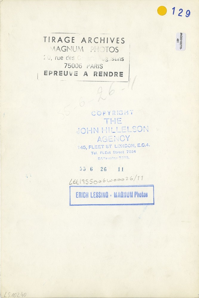 Rückseitig Agentur-Fotografenstempel, Magnum-Archivstempel, Copyrightstempel von »The John Hillelson Agency«, Stempel mit Negativnummer »55-6-26/11« sowie div. Vermerke